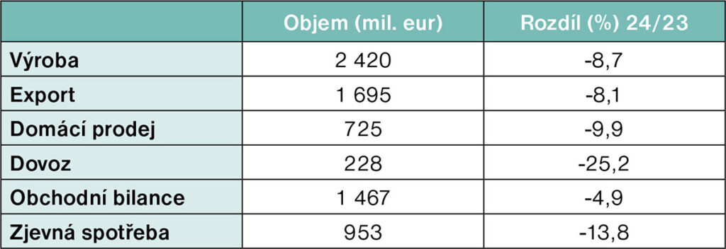 Výrazný pokles zaznamenal také dovoz (228 milionů eur, -25,2 %), což omezilo pokles obchodní bilance na -4,9 % oproti roku 2023 (1,467 miliardy eur). Zjevná spotřeba se zastavila na 953 milionech eur, což sice znamená snížení o 13,8 % oproti výsledkům z roku 2023, ale stále to naznačuje, že italský trh zůstává světovým lídrem.