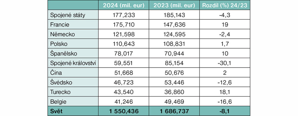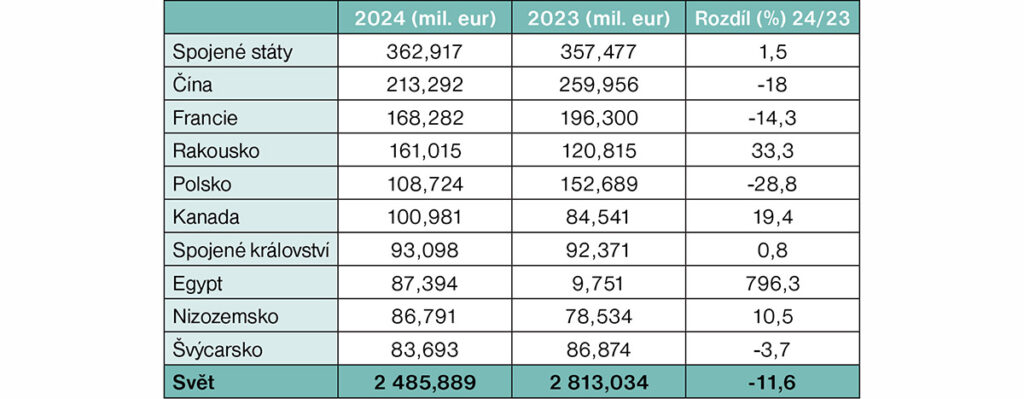 Pojďme k Německu, historickému lídru v mezinárodním obchodu, s exportem ve výši 2,485 miliardy eur (bez nástrojů), což je pokles o 11,6 % oproti 2,813 miliardy v roce 2023. To je horší výsledek než pokles o 8,1 % u italských výrobců. Také v případě Německa jsou „top ten“ nejčastějších cílových zemí Spojené státy (362,9 milionu eur, +1,5 %), následované Čínou (213,2 milionu eur, -18 %) a Francií (168 milionů eur, -14,3 %). V pořadí dále stojí Rakousko, Polsko, Kanada, Spojené království, Egypt, Nizozemsko a Švýcarsko. Egypt zaznamenal skutečný procentuální nárůst z 9,7 milionu v roce 2023 na více než 87 milionů v roce 2024 (+796,3 %).