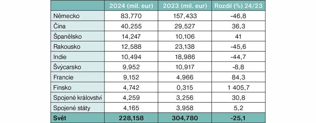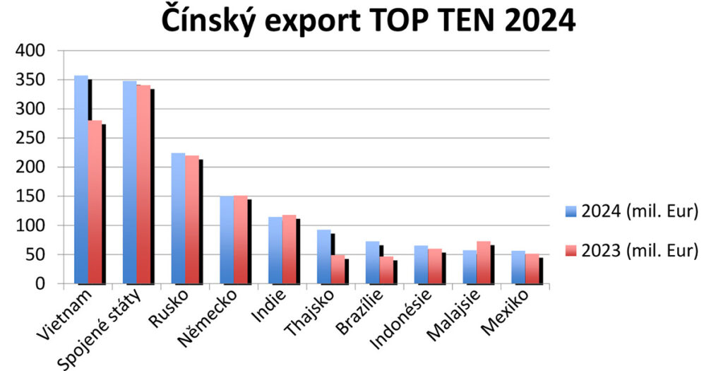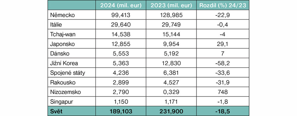 Další byly Japonsko (s nárůstem dovozu čínských strojů o 29,1 %), Dánsko, Jižní Korea, Spojené státy, Rakousko a Nizozemsko, které se posunulo z 329 tisíc eur v roce 2023 na 2,7 milionu v roce 2024, což představuje kvantový skok o 748 %. Desítku nejlepších dovozních zemí uzavřel Singapur.
