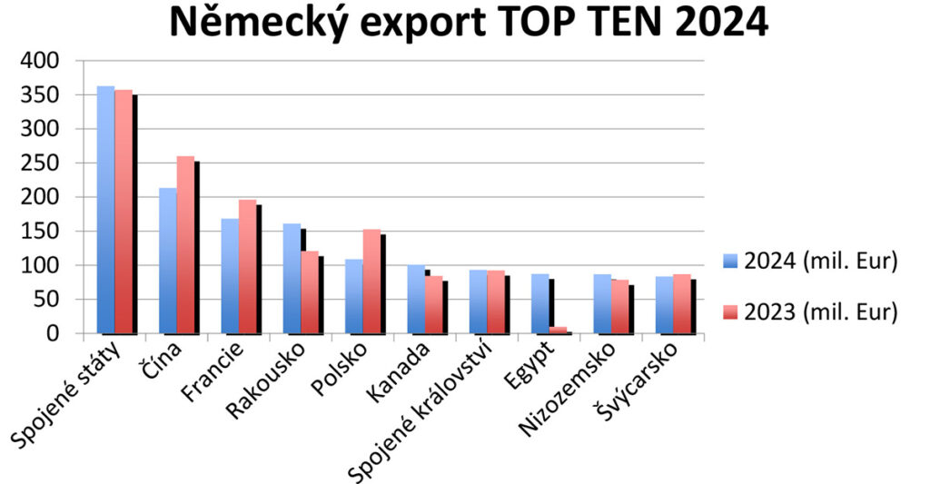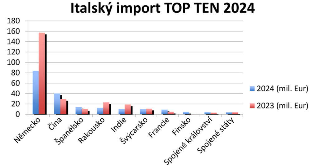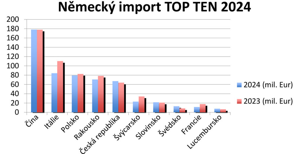 Co se dovozu do Německa týká, obsadila v loňském roce první místo v první desítce Čína s prakticky shodnou hodnotou jako v předchozím roce (178,1 milionu eur oproti 177,8 v roce 2023). Na druhém místě si stejnou pozici jako v roce 2023 udržela Itálie, ale klesla ze 110,2 na 84,2 milionu v roce 2024 (-23,6 %). Německý dovoz z Polska se snížil o 3,7 % (79,5 milionu oproti 82,6), přesto se země stále drží před ostatními exportéry, konkrétně (v sestupném pořadí) Rakouskem, Českou republikou, Švýcarskem, Slovinskem, Švédskem, Francií a Lucemburskem.