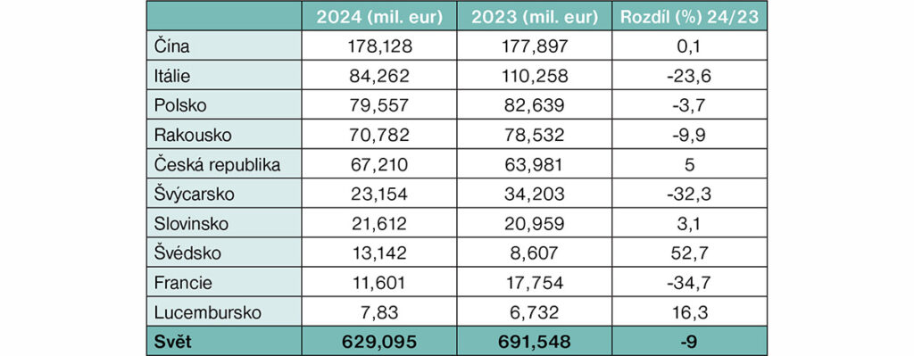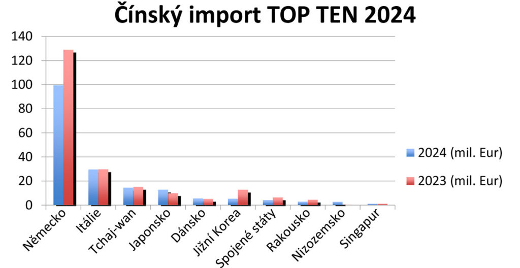 Na straně dovozu – který činil 189,1 milionu eur oproti 231,9 milionu eur v roce 2023 (-18,5 %) – zlatou medaili pro nejvýznamnější dodavatelskou zemi získává Německo, ačkoli jeho hodnota klesla o 22,9 % (ze 128,9 milionu eur v roce 2023 na 99,4 milionu eur v loňském roce). Itálie se s 29,6 miliony eur (-0,4 %) držela pevně na druhém místě a předběhla tak Tchaj-wan, který byl v roce 2023 druhý a v roce 2024 třetí, s prodejem do Číny ve výši 14,5 milionu eur, což je o 4 % méně než v roce 2023.