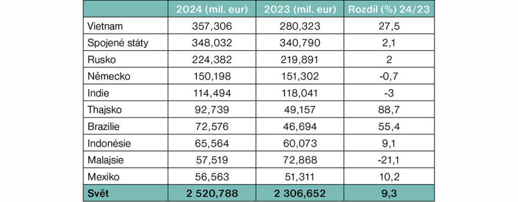 Při bližším pohledu vidíme, že největším fanouškem čínských technologií je Vietnam, který zvýšil svůj nákup od sousední země o 27,5 %, z 280,3 milionu eur v roce 2023 na 357,3 milionu eur v loňském roce. Na druhém místě se umístily Spojené státy (348 milionů eur, +2,1 %) a na třetím Rusko (224,3 milionů eur, +2 %), následované Německem, Indií, Thajskem, Brazílií, Indonésií, Malajsií a Mexikem.
